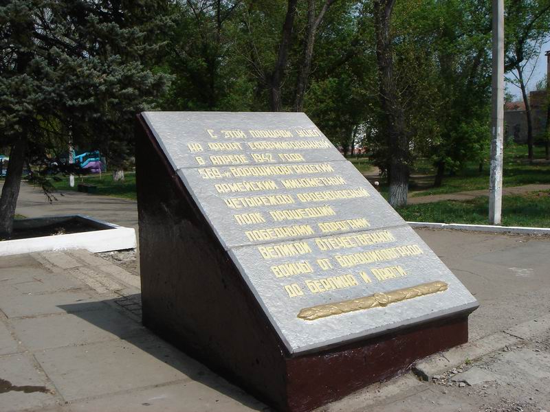 Справка: С этого места ушел на фронт, сформированный в апреле 1942 года, 569-й Ворошиловградский армейский минометный четырежды орденоносный полк, прошедший победными дорогами Великой Отечественной войны от Ворошиловграда до Берлина и Праги.