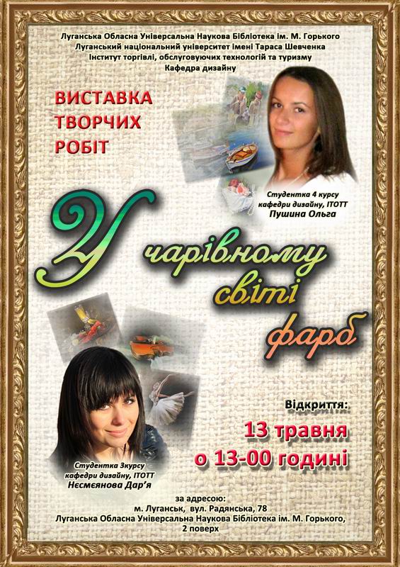 Выставка «В волшебном мире красок» станет первой персональной выставкой студентов-дизайнеров, организованной в стенах библиотеки имени Горького. Студентки кафедры дизайна ЛНУ Дарья Несмеянова и Ольга Пушина в своих картинах стараются передать прекрасное в обыденном, донести до зрителя эстетическую красоту обычных вещей.