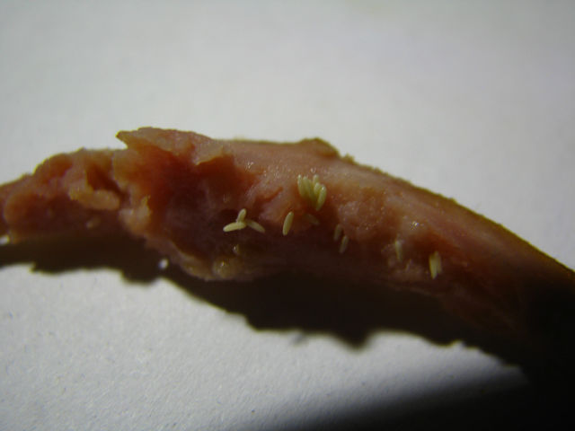 «Придя домой, через 30 минут я съел около трети батона. Через некоторое время необходимо был нарезать этой шинки еще для приготовления другого блюда. То, что я увидел в тот момент, повергло меня в шок. Колбаса осеменена яйцами насекомого какого-то или паразита. Через час после приёма я почувствовал недомогание и повышение температуры. Мне и моей семье пришлось чистить желудки и принимать другие меры по собственному спасению, в том числе и медикаментозное лечение. Я вынужден придать эту ситуацию огласке во всех известных мне соц.сетях и средствах массовой информации, обратиться в Прокуратуру, а так же передать образцы этой продукции и копию заявления в прокуратуру в Санэпидемстанцию и Общество по защите прав потребителей», - пишет луганчанин.