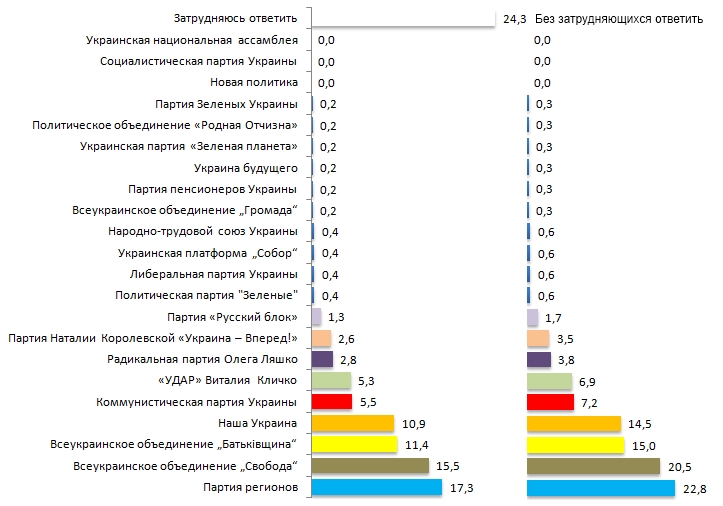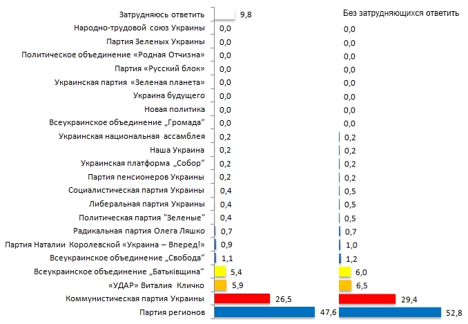 Лидером рейтинга является партия регионов, которая набирает 52,8%. Следом за ней, на твердом втором месте находится коммунистическая партия Украины с 29,4%. Третьей по счету идет «УДАР» Виталия Кличко - 6,5%. За всеукраинское объединение «Батькiвшина» готовы проголосовать 6,0% опрошенных. Все остальные политические партии набирают меньше двух процентов. К слову, за ВО «Свободу» готовы проголосовать всего 1,2% респондентов, что вряд ли стоит тех усилий, которые проявляет партия регионов по борьбе с ними в регионе.