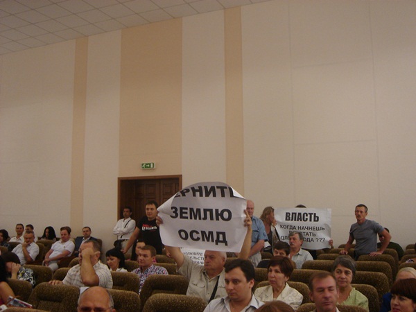 Возмущенные луганчане перекрикивали Луганского городского голову и стояли с плакатами: «Власть, когда начнешь работать для народа???», «Верните землю ОСМД» и др.