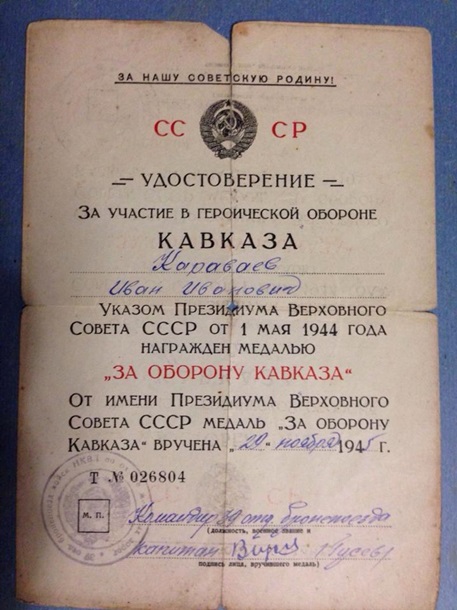 Мій прадід Іван Іванович Караваєв. Був нагороджений медаллю "За героїчну оборону Кавказу". Коли повернувся з фронту - не міг знайти роботу, пішов за допомогою у Сватівський райком партії Луганської (Ворошиловградської) області. Там йому відмовили. Він каже: