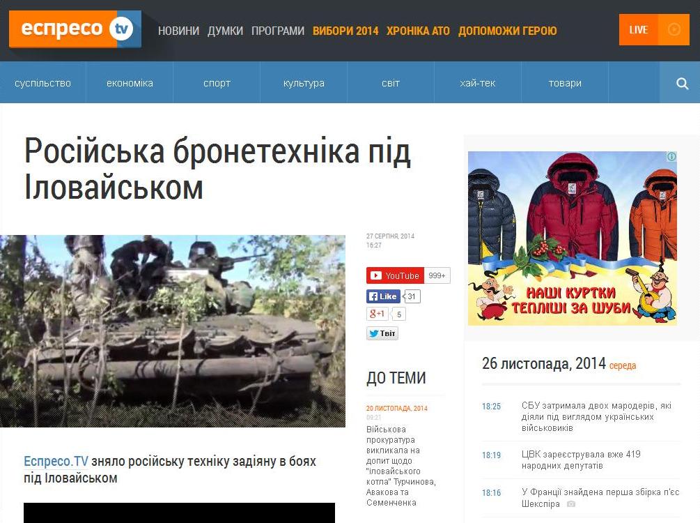 Итак, первые безусловные доказательства присутствия российских танков Т-72Б3 были получены 27-го августа. В этот день канал «Эспресо.TV» в заметке «Російська бронетехніка під Іловайськом» («Российская бронетехника под Иловайском») опубликовало видео, на котором украинские солдаты демонстрируют захваченный под Иловайском российский танк и обнаруженные в нём предметы.