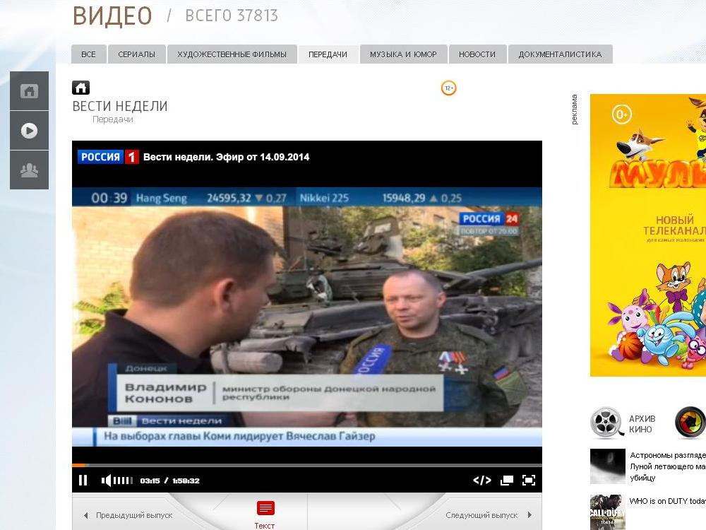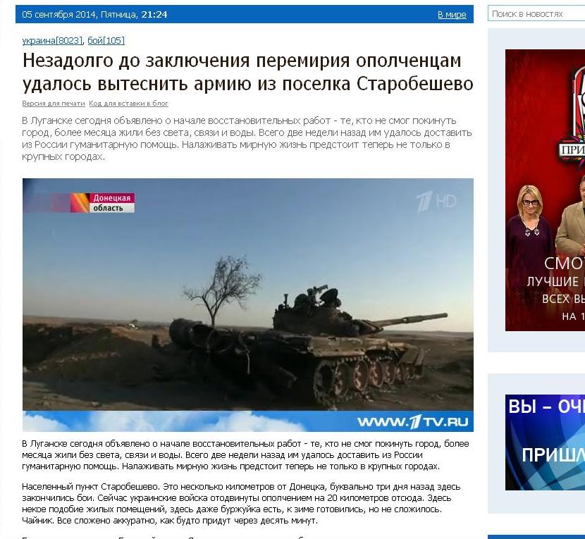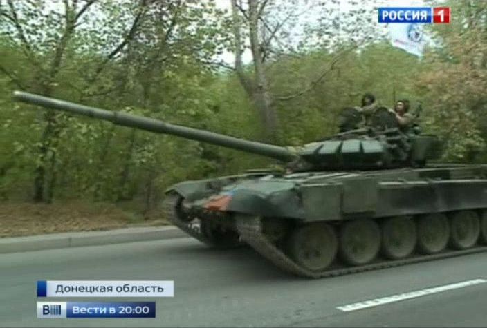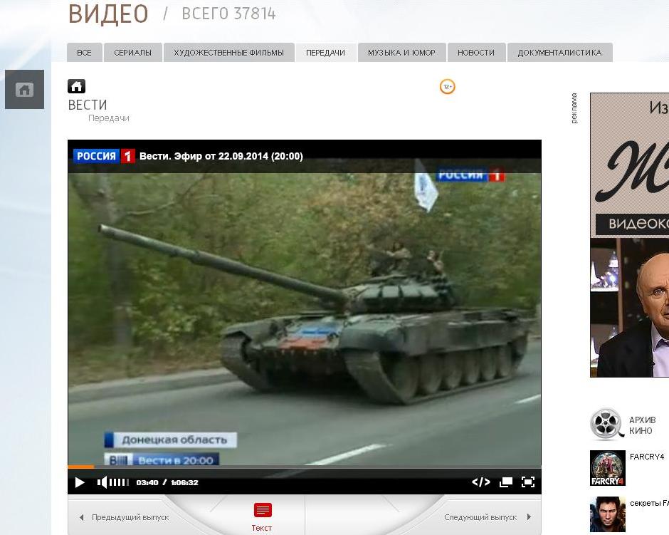 14-го сентября он появляется в выпуске передачи «Вести недели» канала «Россия 1″. По своему невежеству российские «журналисты» запустили в эфир сюжет о российском танке Т-72Б3 (как покажут примеры ниже, это далеко не последний ляп пропагандистов из кремлёвских СМИ). Это при том, что присутствие российских войск и техники в Украине Путин всячески пытается скрывать и отрицает с упорством закоренелого кэгэбиста.