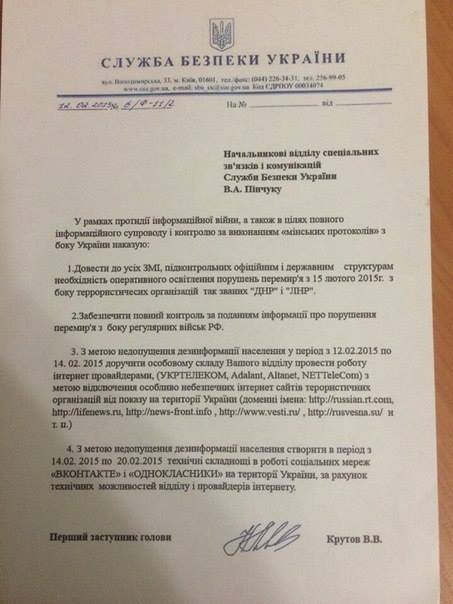 Во-первых, Крутов был снят с должности еще 7 июля 2014 года. Во-вторых, оформление текста не соответствует нормативам делопроизводства. В- третьих, такого отдела, как «отдел специальной связи и коммуникаций» в природе не существует.
