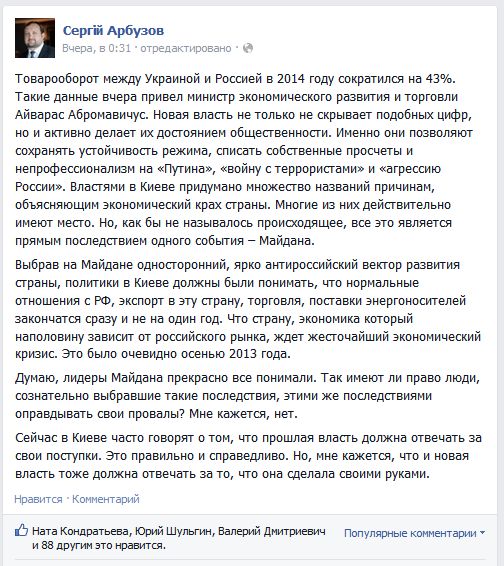 Бывший глава НБУ, Сергей Арбузов (https://www.facebook.com/SergiyArbuzov), описывает (https://www.facebook.com/SergiyArbuzov/posts/852643421463944) положение дел следующим образом: «Товарооборот между Украиной и Россией в 2014 году сократился на 43%. Такие данные сегодня привел министр экономического развития и торговли Айварас Абромавичус. Новая власть не только не скрывает подобных цифр, но и активно делает их достоянием общественности. Именно они позволяют сохранять устойчивость режима, списать собственные просчеты и непрофессионализм на «Путина», «войну с террористами» и «агрессию России». Властями в Киеве придумано множество названий причинам, объясняющим экономический крах страны. Многие из них действительно имеют место. Но, как бы не называлось происходящее, все это является прямым последствием одного события – Майдана».