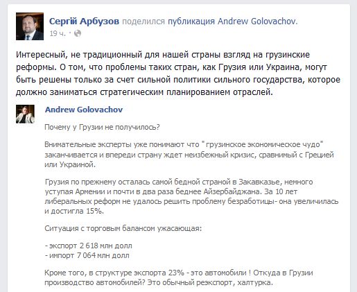 Есть в экономике такое понятие, как протекционизм. Это, если коротко, означает рыночную экономику но не исключительно на принципах свободного рынка, а с контролем рынка со стороны государства. У нас же хотят всего и сразу – если неолиберализм, так без государства, если рынок, так сам по себе чтоб работал. Ярким примером того, что таких чудес в экономике не бывает, стала современная Грузия. Уже в 2013 году стало понятно, что «грузинское экономическое чудо» потихоньку заканчивается и скоро Грузию ждет судьба Греции, только с более жесткими последствиями, так как Греция брала в долг колоссальные кредиты хотя бы на правах члена ЕС – у Грузии и таких привилегий нет.