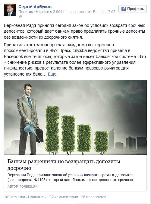 «Закон не сможет стать спасительным кругом в условиях паники населения, продолжающего оттока депозитов, фактического краха банковской системы. Принятие закона сейчас приведет лишь к тому, что украинцы, которым никто не объяснил, что именно означает запрет досрочного расторжения, предпочтут не рисковать и вовсе откажутся от услуг банков. Более того, будут забирать даже те срочные вклады, которые еще есть в системе».