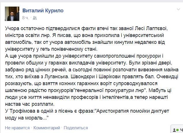 В конце учебного года выяснилось, что для получения аттестата российского образца школьники должны сдать все экзамены на территории РФ. По словам же луганских студентов, они также должны самостоятельно ехать за обещанными российскими дипломами в Ростов, поскольку обещанной им системы перевода нет, и необходимо поступать заново. При этом при поступлении в учебные заведения России нужно сдать академическую разницу. Как сообщают луганчане, «в среднем по каждой кафедре получается 20-30 предметов и нас предупредили, что это обойдется в кругленькую сумму». Чтобы смягчить удар по репутации всей «республики», пришлось сначала «вывезти» горе-министра вместе с супругом в кардиологический центр на лечение, а потом и вовсе отправить в бега и завести уголовное дело. Как проводились обыски в университете им. Т. Шевченко на своей страничке в facebook подробно описал президент ВУЗа Виталий Курило: