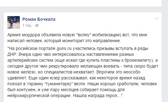 Как пишет Роман, на одном из сепаратистских порталов участились призывы вступать в «армию» «ДНР» в связи с тем, что из России прибудет новая боевая техника и артиллерийские системы, а у боевиков не хватает «специалистов», которые бы могли всем этим управлять.