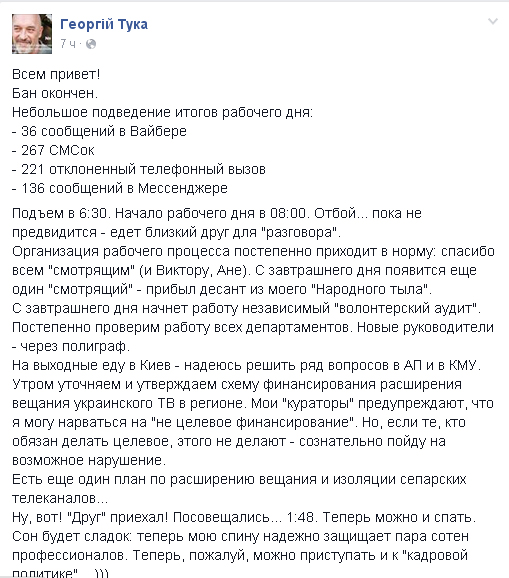 Георгию Туке уже помогают соратники по волонтерской деятельности. Кроме того, Глава обладминистрации приглашает и других добровольцев. Судя по комментариям, людей предложение заинтересовало. Среди первых своих дел глава анонсировал «расширение вещания украинских каналов в регионе и изоляция сепарских».