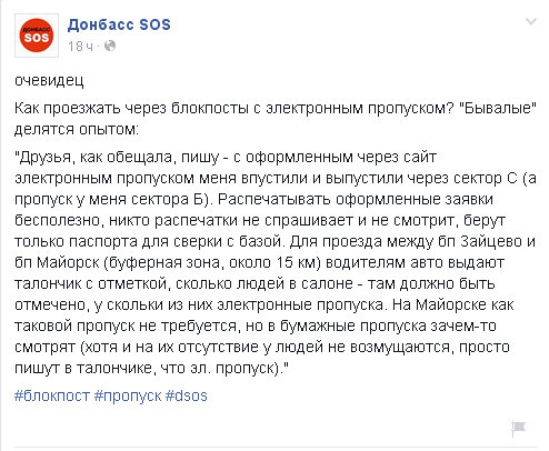 «Друзья, как обещала, пишу - с оформленным через сайт электронным пропуском меня впустили и выпустили через сектор С (а пропуск у меня сектора Б). Распечатывать оформленные заявки бесполезно, никто распечатки не спрашивает и не смотрит, берут только паспорта для сверки с базой. Для проезда между блокпостом Зайцево и блокпостом Майорск (буферная зона, около 15 км) водителям авто выдают талончик с отметкой, сколько людей в салоне - там должно быть отмечено, у скольких из них электронные пропуска. На Майорске как таковой пропуск не требуется, но в бумажные пропуска зачем-то смотрят (хотя и на их отсутствие у людей не возмущаются, просто пишут в талончике, что эл. пропуск)»
