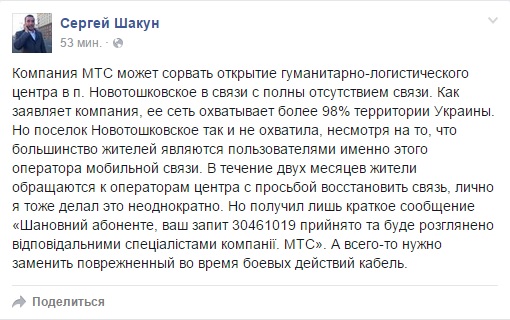 Причина – в Новотошковке… нет связи. МТС не покрывает поселок. Без этого не смогут работать многие функции гуманитарно-логистического центра. Более того, как утверждает Сергей Шакун, проблему не удается решить и на управленческом уровне.