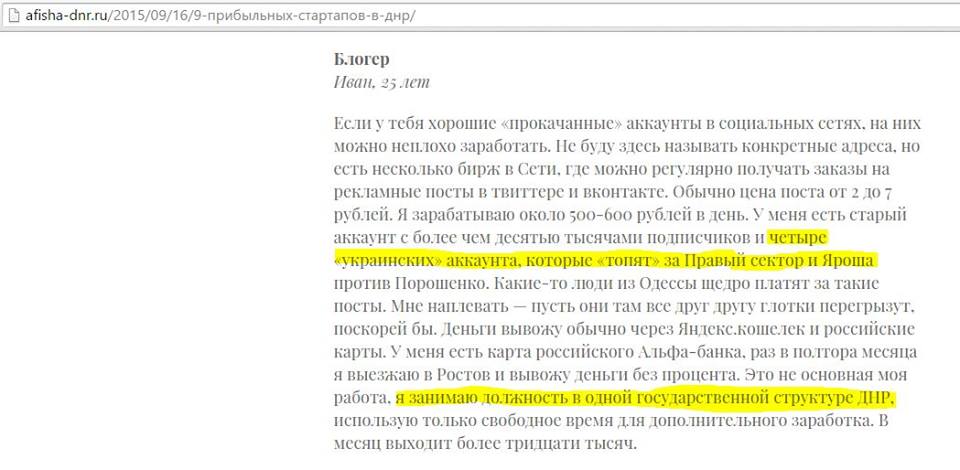 "Если у тебя хорошие «прокачанные» аккаунты в социальных сетях, на них можно неплохо заработать. Не буду здесь называть конкретные адреса, но есть несколько бирж в Сети, где можно регулярно получать заказы на рекламные посты в твиттере и вконтакте. Обычно цена поста от 2 до 7 рублей. Я зарабатываю около 500-600 рублей в день. У меня есть старый аккаунт с более чем десятью тысячами подписчиков и четыре «украинских» аккаунта, которые «топят» за Правый сектор и Яроша против Порошенко. Какие-то люди из Одессы щедро платят за такие посты. Мне наплевать — пусть они там все друг другу глотки перегрызут, поскорей бы. Деньги вывожу обычно через Яндекс.кошелек и российские карты. У меня есть карта российского Альфа-банка, раз в полтора месяца я выезжаю в Ростов и вывожу деньги без процента. Это не основная моя работа, я занимаю должность в одной государственной структуре ДНР, использую только свободное время для дополнительного заработка. В месяц выходит более тридцати тысяч", - рассказал некто блогер Иван.