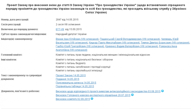 Законопроектом №2847 предлагается дополнить статью 9 закона «О гражданстве Украины» положением, что для иностранцев и лиц без гражданства, которые в установленном законодательством Украины порядке проходят военную службу по контракту в ВСУ, срок непрерывного проживания на законных основаниях на территории Украины устанавливается на три года с момента вступления в силу контракта.