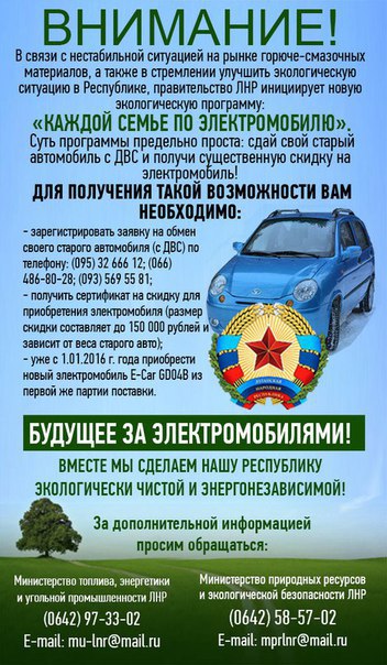 Акция проводится так называемым «правительством ЛНР» в связи с тем, что на оккупированных территориях Луганской области тяжелая ситуация с обеспечением топливом. Суть программы проста: нужно сдать свой автомобиль, который ездит на бензине, а потом купить электромобиль со скидкой.