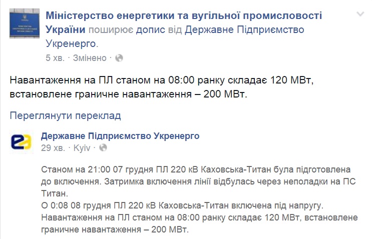 В 0:08 8 декабря высоковольтная линия 220 кВ Каховская-Титан включена под напряжение. Нагрузка на высоковольтную линию по состоянию на 08:00 утра составляет 120 МВт, установленная предельная нагрузка - 200 МВт».
