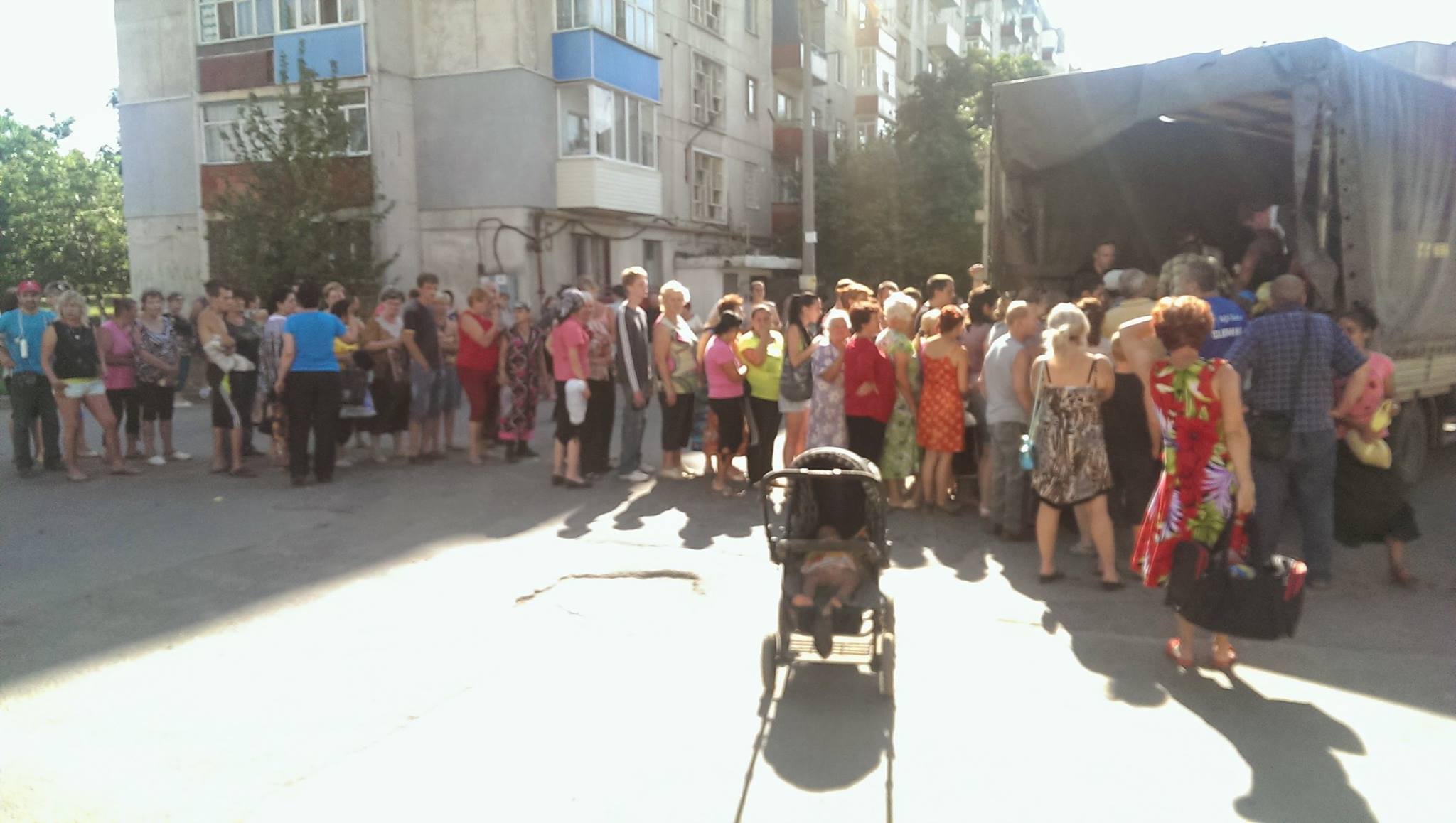 Мы проехали через весь город и район РТИ возле магазина АТБ решили устроить временный пункт раздачи помощи. В городе нашли местных активистов, они организовали грамотную раздачу помощи, без суеты, без толкотни.