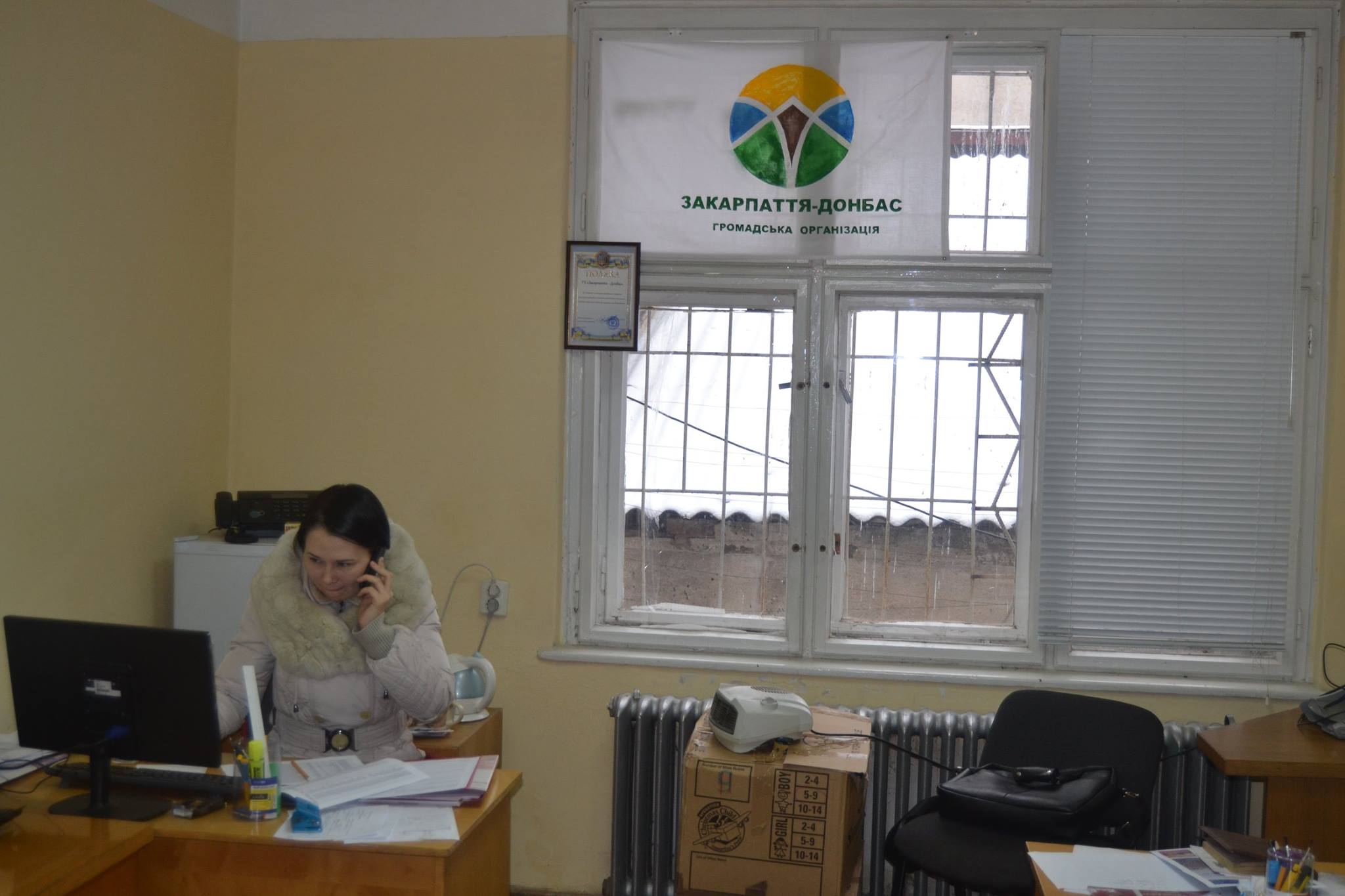 Несмотря на статусное здание, в котором расположен офис общественной организации «Закарпатье-Донбасс», само помещение не создаёт ощущение респектабельности. Пространство заполнено наспех принесённой канцелярской техникой и ящиками с гуманитаркой. В углу виднеется красочная обёртка сложенных в картонные коробки новогодних подарков для детей. Постоянно греется электрический чайник. Волонтёр организации, переселенка из Макеевки, Татьяна Хорошилова как раз занимается тем, что обзванивает подопечных, у кого есть дети, с просьбой получить сладкие наборы в ближайшее время. На мой вопрос, не государство ли расщедрилось на подарки, Татьяна с немного грустной улыбкой заметила, что на правительство в данном случае рассчитывать не приходится. По её словам, детские сладкие наборы предоставили давние партнёры «Закарпатье – Донбасс» – благотворительная организация «Центр громадських ініціатив». Около года назад закарпатские волонтёры-переселенцы смогли выбрать грант от партнёров, закупив на полученные средства оргтехнику и создать собственный сайт.