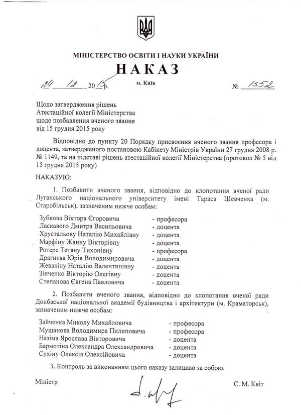 Ряд преподавателей, которые остались работать на оккупированных территориях «ЛНР», согласно приказу Министра образования Сергея Квита, лишили учёных званий.