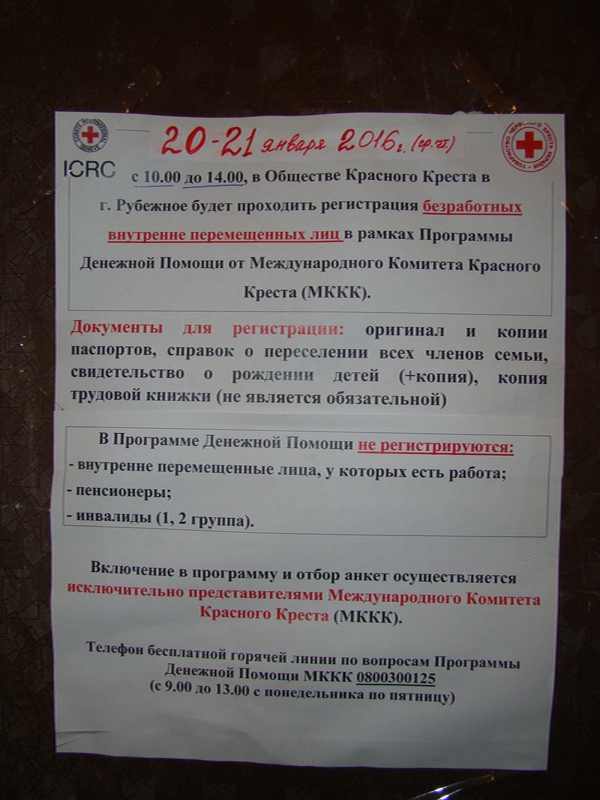 В городе Рубежное Луганская область с 20 января 2016 года началась регистрация безработных переселенцев на получения денежной помощи от международного Красного Креста. Волонтеры Красного Креста сообщили, что регистрация возобновится в конце февраля.