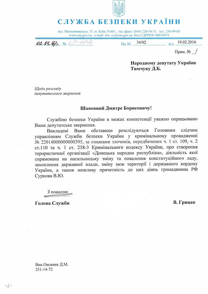 На его депутатское обращение ответил глава СБУ, из которого следует, что В.Сурков фигурирует в уголовном деле о создании и деятельности террористической организации «ДНР».