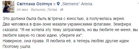 Когда она увидела со сцены, как представители украинской диаспоры развернули флаг, то в нецензурной и грубой форме потребовала, чтобы его убрали.