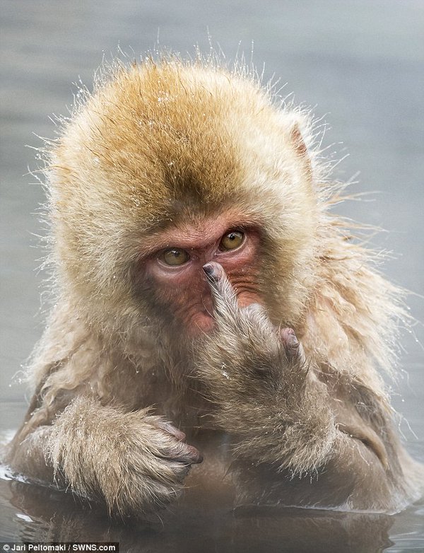 Маленькая обезьяна в японском парке Дзигокудани непроизвольно показала средний палец фотографу, когда тот хотел запечатлеть, как она принимает утреннюю ванну.