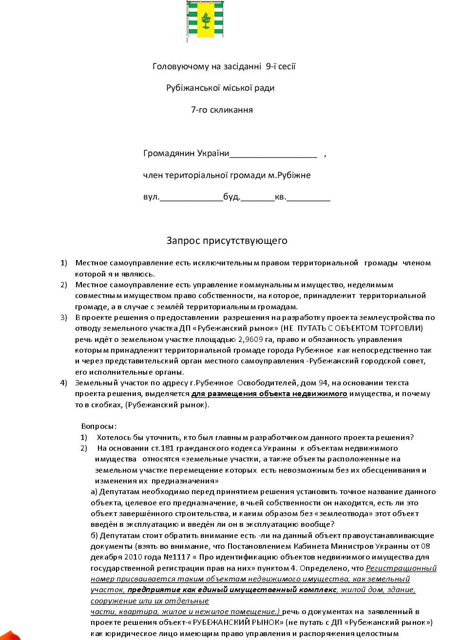 «Мы хотим, чтобы наш городской бюджет наполнялся, и город Рубежное благоустраивался. Если Центральный рынок переведут в коммунальную собственность, в Рубежное будет нормальное освещение на улицах, отремонтированы дороги, и будут работать все детские сады и школы», - отметил Владимир Николайчук представитель инициативной группы.
