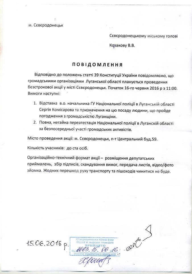 «Акция бессрочная, будут круглосуточно стоять палатки. Основные требования: отставка и.о. начальника ГУ Национальной полиции в Луганской области Сергея Комиссарова и назначение на эту должность специалиста согласованно с общественностью», - сказано в сообщении.