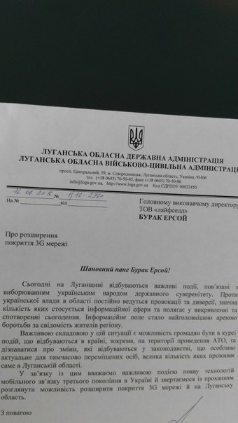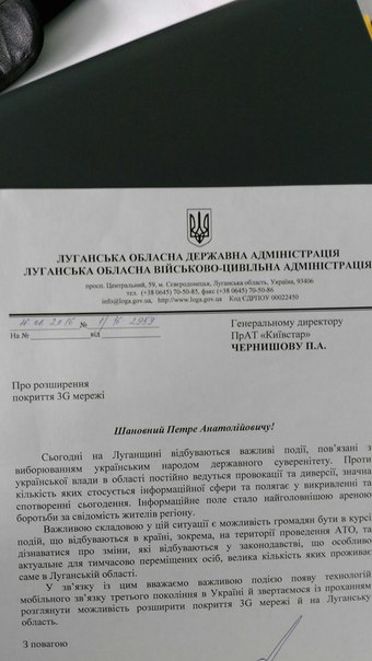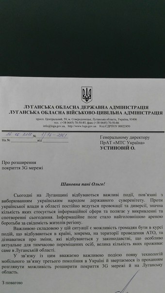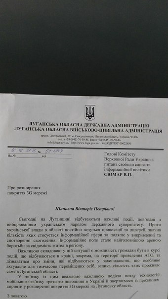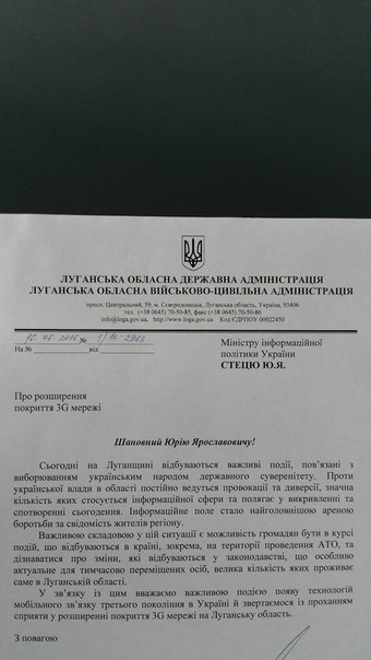 «…обращаемся с просьбой поспособствовать расширению покрытия 3G связи в Луганской области», - сказано в обращении.