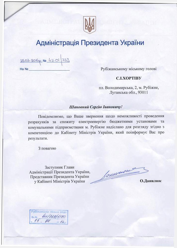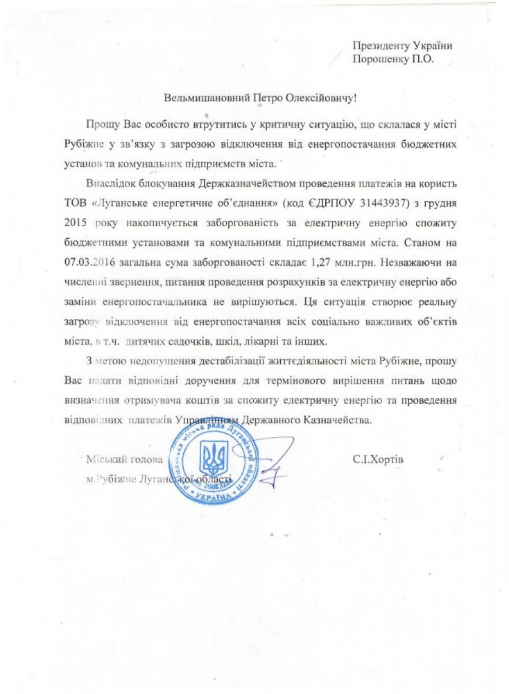«Прошу Вас особисто втрутитися в критичну ситуацію, яка склалася в місті Рубіжне в зв'язку з загрозою відключення від енергопостачання бюджетних установ та комунальних підприємств міста», - сказано в зверненні до Президента.