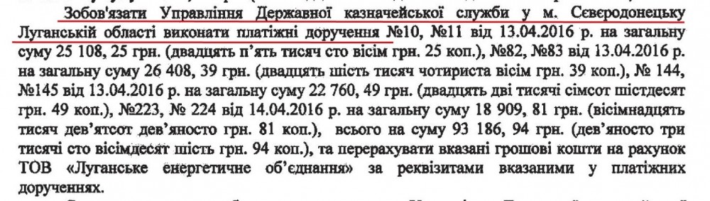 «Місто Рубіжне знаходиться на території підконтрольної органам державної влади і здійснює казначейське обслуговування через Управління держказначейства в м. Рубіжне, яке також знаходиться на території підконтрольній українській владі. Рахунки ТОВ «ЛЕО», за якими виконкомом проводяться розрахунки за спожиту електроенергію, відкриті в філії Луганського обласного АТ «Ощадбанк» та АТ «Райффайзен банк Аваль» в Києві.