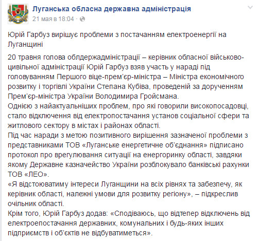Під час наради з метою позитивного вирішення зазначеної проблеми з представниками ТОВ «Луганське енергетичне об’єднання» підписано протокол про врегулювання ситуації на енергоринку області, завдяки якому Державне казначейство України розблокувало банківські рахунки ТОВ «ЛЕО».