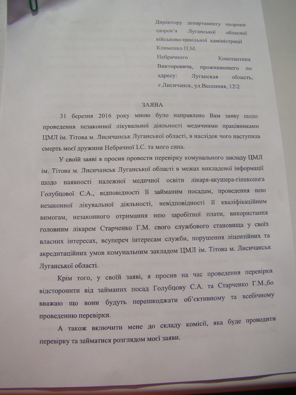 Муж Ирины рассказывает, что все было в порядке, и никто даже не мог себе представить такого жуткого развития событий. В 2011 году, 29 ноября Ирина попала в Лисичанскую больницу им. Титова с простудой. Девушка была на восьмом месяце беременности. Ее положили в инфекционное отделение, но никто не провел осмотр, так как заведующей отделением не было на месте. Только через сутки ей прописали самое примитивное лекарство от простуды и оставили в инфекционном отделении. Хотелось бы отметить, что Ирина сама работала в этой больнице, и, казалось бы, отношение к ней должно было быть самым трепетным.