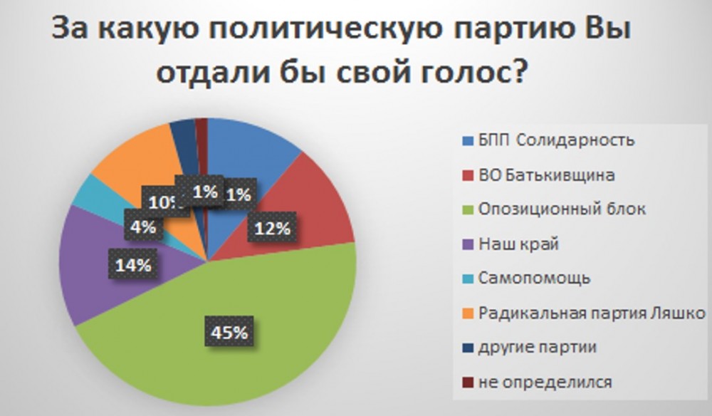 «Из опрошенных 575 респондентов, 500 пойдут на выборы. На вопрос «За какую политическую партию вы отдали бы свой голос?» избиратели ответили: на первом месте - за политическую партию «Оппозиционный блок», на втором месте «Наш край», на третьем – ВО Батькивщина и "Солидарность", - сказано в сообщении волонтеров.