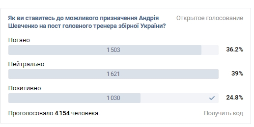 Популярное в социальной сети VK сообщество «УКРАЇНА LIVE - НОВИНИ ▪ АТО», сделало опрос, в котором каждый желающий смог выразить свой взгляд по поводу возможного назначения Андрея Шевченко на пост главного тренера Национальной сборной Украины по футболу.