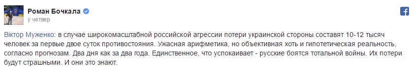 "В случае широкомасштабной российской агрессии, потери украинской стороны составят 10-12 тысяч человек за первые двое суток противостояния. Ужасная арифметика, но объективная хоть и гипотетическая реальность, согласно прогнозам. Два дня как за два года. Единственное, что успокаивает – русские боятся тотальной войны. Их потери будут страшными. И они это знают", - сказал Муженко.