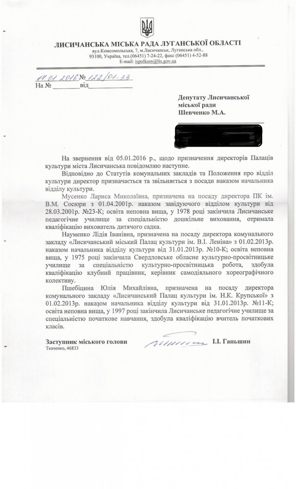 В Лисичанске директором коммунального учреждения «Лисичанский Дворец культуры «Диамант» назначили депутата от «Оппоблока» Юлию Пшебицину, у которой нет высшего образования.