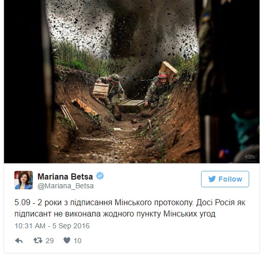"5.09 – 2 года с момента подписания Минского протокола. До сих пор Россия как подписант не выполнила ни одного пункта Минских соглашений", – отметила она.