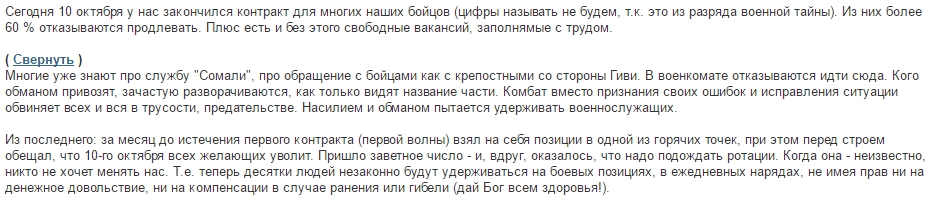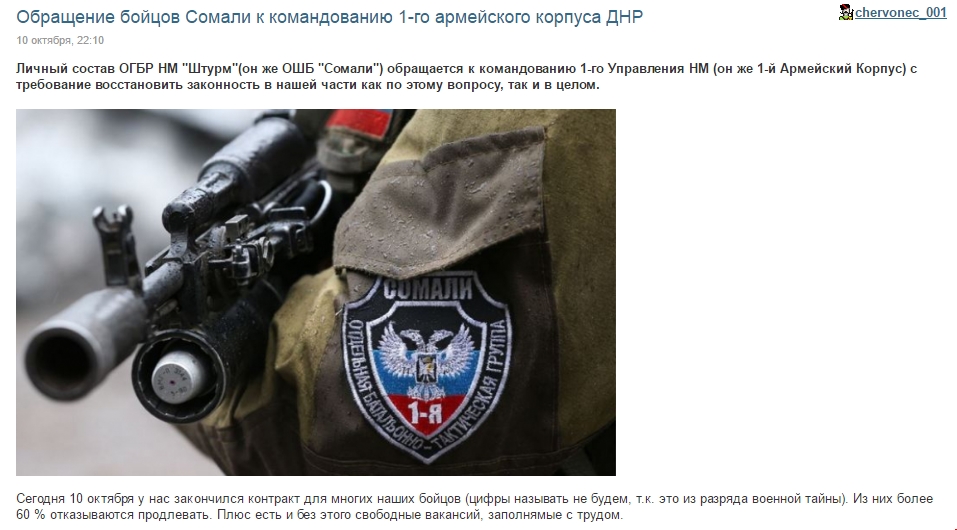 По их словам 60% террористов отказываются продлевать так назывемый "контракт". Кроме того, никто не хочет идти в печальноизвестный "батальон", по той причине, что "Гиви" относится к подчиненным, как к крепостным. Вместо признания собственных ошибок "легендарный комбат" обвиняет своих подчиненных в трусости и предательстве.
