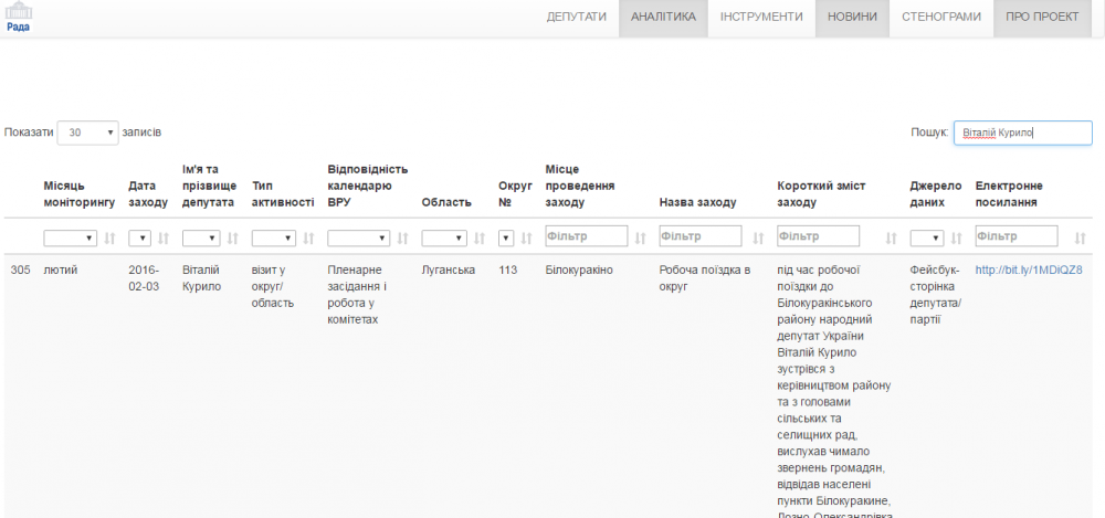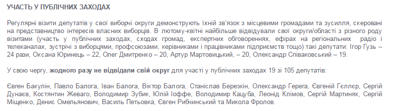 Один раз в год народный депутат должен отчитываться перед своими избирателями о проделанной работе. На сайте Общественной сети ОПОРА rada.oporaua.org собрана информация о деятельности каждого народного 8-ого созыва Верховной Рады. Можно посмотреть, перейдя по ссылкам, как работают народные депутаты, которые представляют Луганскую область.