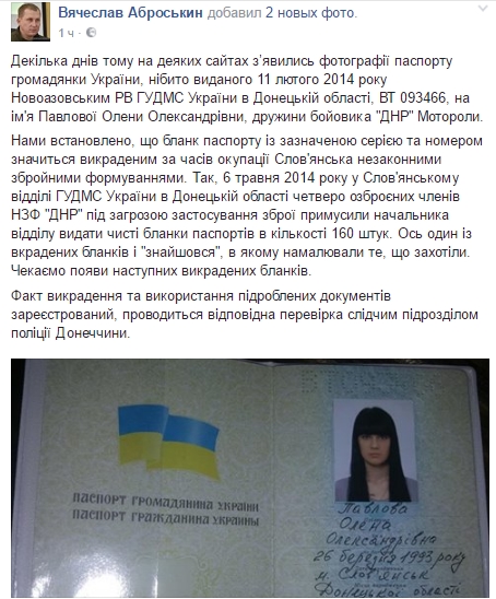 По словам главы Донецкой полиции Вячеслава Аброськина, данный паспорт был украден во время оккупации Славянска незаконными вооруженными бандформированиями. Об этом он написал на своей странице в Facebook: