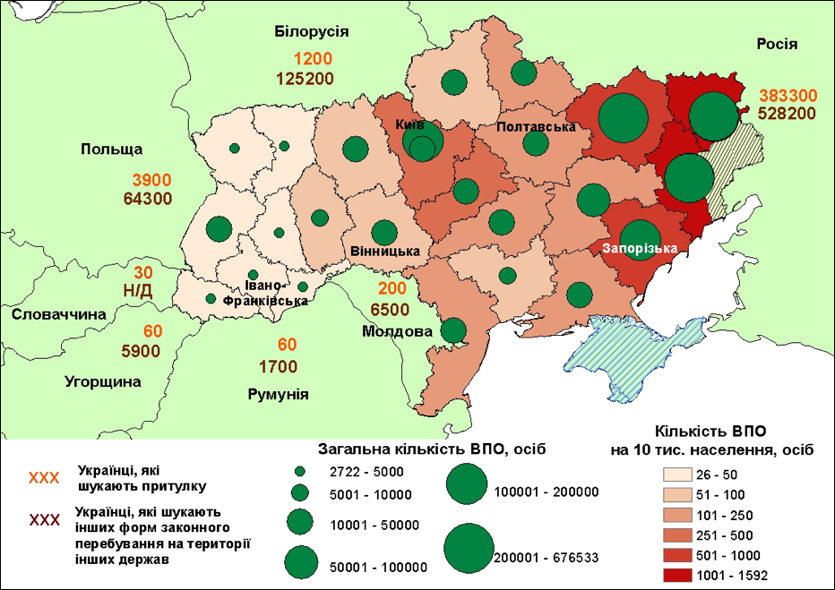 По данным Минсоцполитики, больше всего внутренне перемещенных лиц зарегистрировано в Донецкой, Луганской, Харьковской, Запорожской, Днепропетровской и Киевской областях, в г. Киеве. Наименьшее количество ВПЛ расселено в Тернопольской, Черновицкой, Ровенской, Закарпатской, Ивано-Франковской и Волынской областях. Выбор значительной частью ВПЛ ближайших к местам прежнего жительства регионов свидетельствует о намерении вернуться в покинутые дома.1