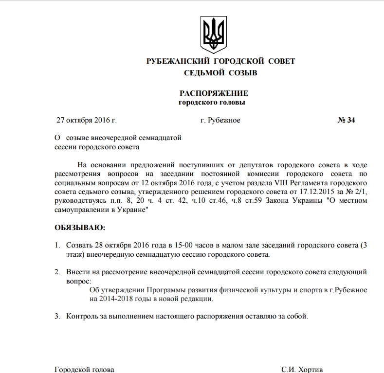 Проект решения подписан мэром Рубежного Сергеем Хортивым. На повестке дня один вопрос: «Об утверждении Программы развития физической культуры и спорта в г.Рубежное на 2014-2018 годы в новой редакции».