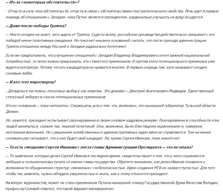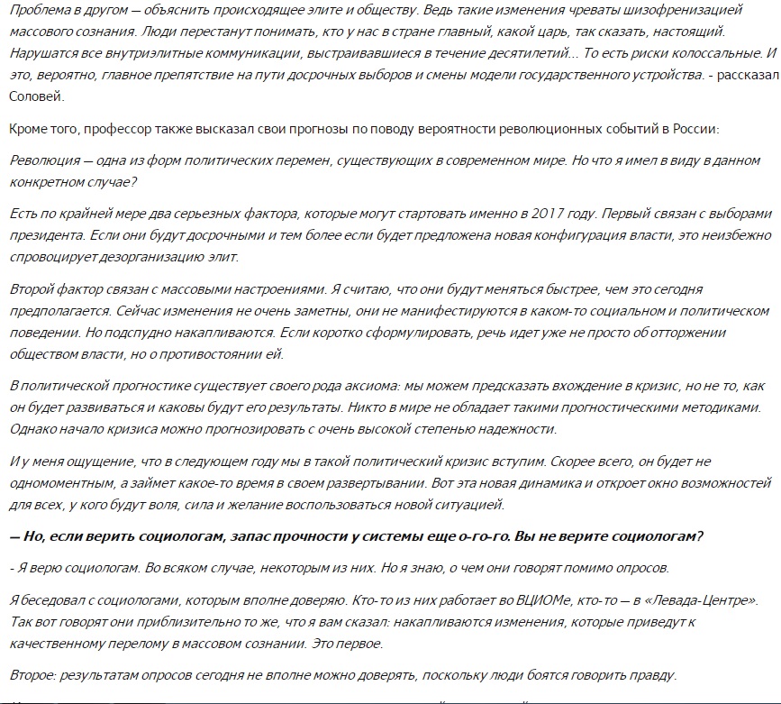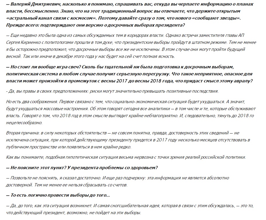 Валерий Соловей говорит о вероятном уходе Владимира Путина в 2017 году и возможных переменах в РФ. Также знаменитый политолог намекнул, что у президента России имеются серьезные проблемы со здоровьем.