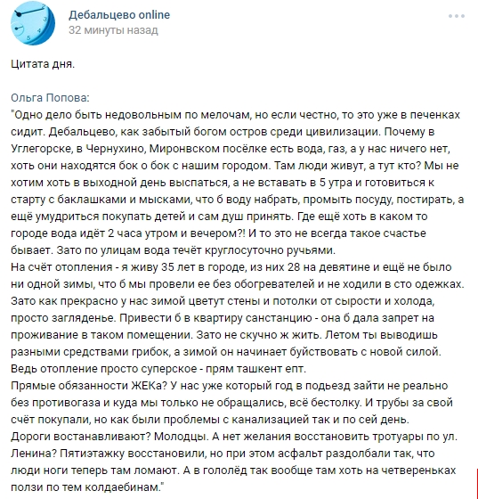 "Одно дело быть недовольным по мелочам, но если честно, то это уже в печенках сидит. Дебальцево, как забытый богом остров среди цивилизации. Почему в Углегорске, в Чернухино, Миронвском посёлке есть вода, газ, а у нас ничего нет, хоть они находятся бок о бок с нашим городом. Там люди живут, а тут кто? Мы не хотим хоть в выходной день выспаться, а не вставать в 5 утра и готовиться к старту с баклашками и мысками, что б воду набрать, промыть посуду, постирать, а ещё умудриться покупать детей и сам душ принять. Где ещё хоть в каком то городе вода идёт 2 часа утром и вечером?! И то это не всегда такое счастье бывает. Зато по улицам вода течёт круглосуточно ручьями.