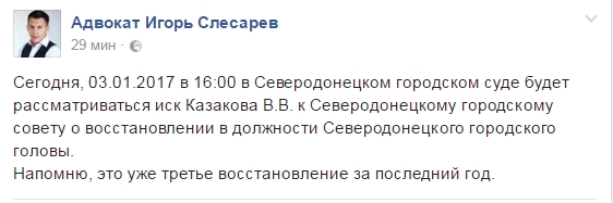 3 января в 16.00 в Северодонецкий городской суд рассмотрит иск мэра города Валентина Казакова к городскому совету по поводу его восстановления в должности городского головы.