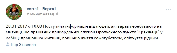 Сообщество "Варта 1" сообщает, что работник пограничной службы пункта пропуска "Краковец" совершил самоубийство.
