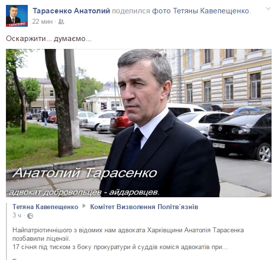 «Найпатріотичнішого з відомих нам адвоката Харківщини Анатолія Тарасенка позбавили ліцензії.17 січня під тиском з боку прокуратури й суддів комісія адвокатів припинила на три місяці ліцензію адвокату Тарасенку. Це сталося після виправдального вироку у справі політв'язня волонтера-АТОшника Володимира Панкевича», - сказано в пості.